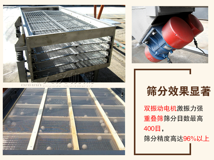 直線振動篩采用雙振動電機反向同步驅動,運行可靠,激振力強,有重疊篩選法、分層序列法以及聯合篩選法,篩分目數高400目,篩分精度高達96%以上,可篩選出7種粒度規格不同的物料。