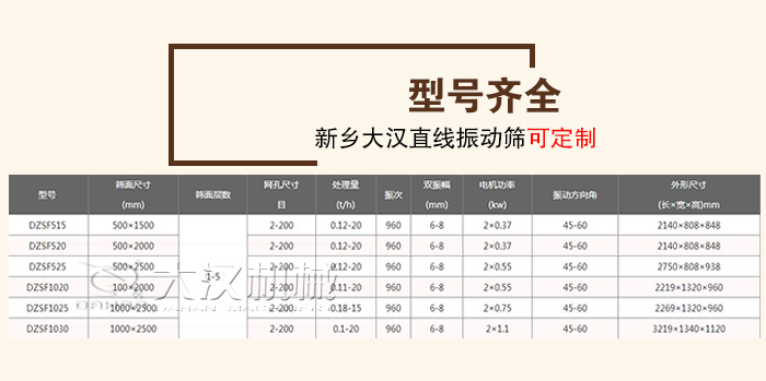 大漢廠家生產的直線振動篩型號有DZSF515、DZSF520、DZSF525、DZSF1020、DZSF1025、DZSF1030等,不同星海對應的篩分產量不同,可以更好地滿足用戶的篩分需要,新鄉大漢直線振動篩可支持定制,您只需要告訴我您的要求,剩下的交給我們解決。