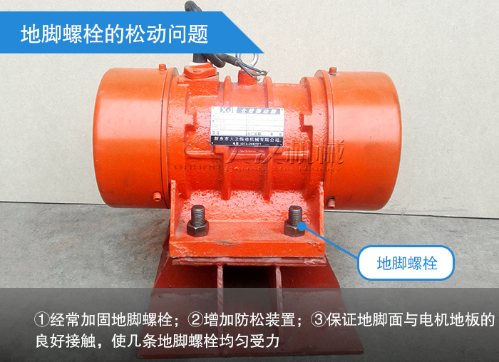 在選材上,盡量使用殼座體的振動電機(即地腳面在機殼上),因地腳面是次加工而成,故能保證其水平。而殼座異體(即地腳面在兩端端蓋上),因地腳面是分次加工,再組裝而成,由于裝配誤差的存在,不易保證其地腳面的水平,這樣幾地腳螺栓的受力就不易均勻,而受力較大的螺栓就容易松動,進而引起其它螺栓的松動、斷裂,燒毀電機。