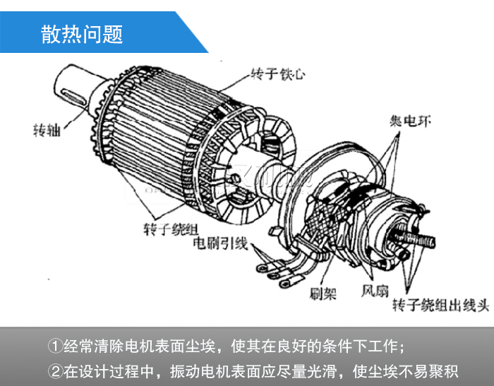 普通電機端有風扇,工作時使風向順著機殼上面的立筋流動,不僅散熱較快,而且也清除了上面的塵埃,使電機在良好的狀態(tài)下工作。而振動電機因無風扇可散熱,全靠自然冷卻,再加上工作環(huán)境大都非常惡劣,粉塵大,粉塵極易在電機表面堆積,從而引起內(nèi)部溫度過高,燒毀電機。